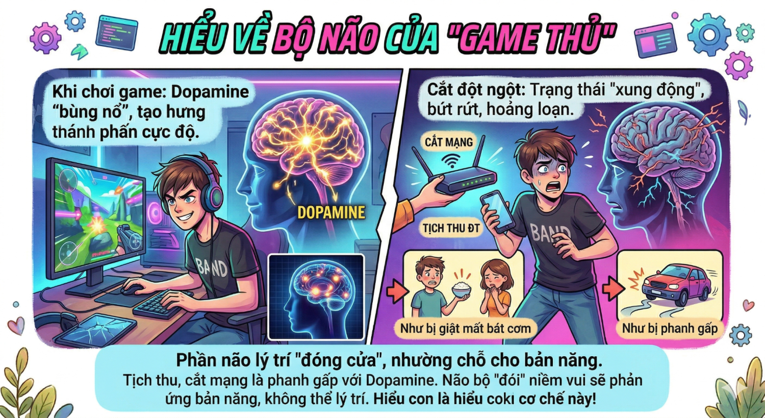 Để thấu hiểu con, trước hết chúng ta cần hiểu về những gì đang diễn ra trong bộ não nhỏ bé ấy. Khi chơi game, não bộ trẻ tiết ra một lượng lớn Dopamine – chất tạo cảm giác hưng phấn cực độ.