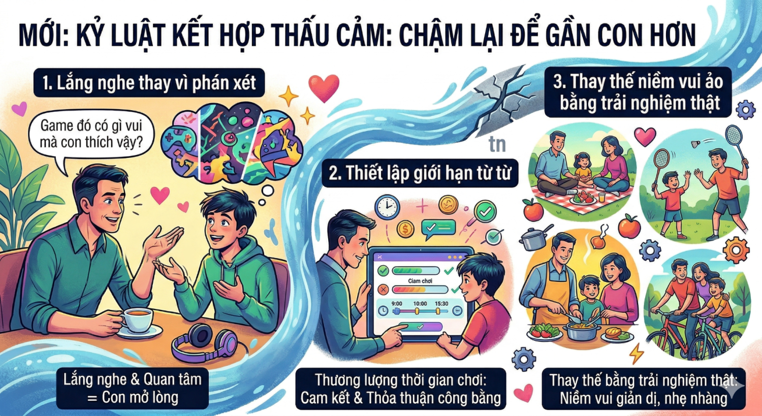 Thay vì dùng "thép" để uốn nắn, chúng ta hãy thử dùng "nước" để xoa dịu. Kỷ luật là cần thiết, nhưng phải đi đôi với sự thấu cảm. Đừng vội mắng "sao con lười thế", hãy thử hỏi "game đó có gì vui mà con thích vậy?". Khi con thấy mình được quan tâm, con mới sẵn sàng mở lòng. Cũng đừng cắt đứt ngay lập tức. Hãy cùng con thương lượng về thời gian chơi và thực hiện đúng cam kết. Hãy coi đó là một thỏa thuận công bằng thay vì một lệnh cấm. Đôi khi con nghiện game vì cuộc sống đời thực quá khô khan. Một buổi cả nhà cùng đi dã ngoại, một trận cầu lông hay cùng nhau nấu bữa tối có thể giúp não bộ trẻ làm quen lại với những niềm vui giản dị, nhẹ nhàng.