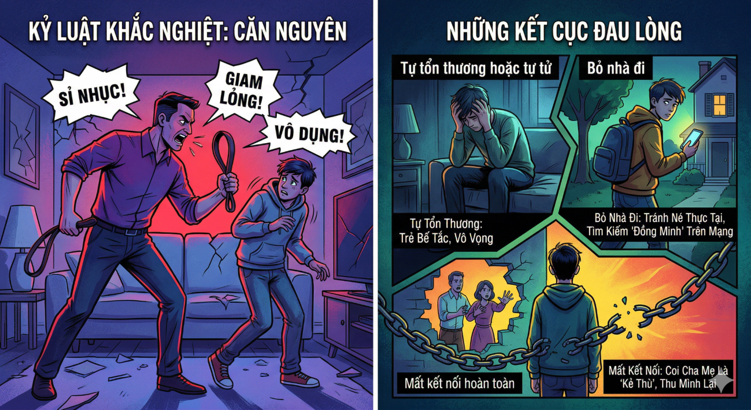 Nhiều bậc phụ huynh vì quá nóng lòng muốn con tốt lên nên đã chọn cách kỷ luật thô bạo: đòn roi, sỉ nhục hoặc giam lỏng. Tuy nhiên, ở tuổi dậy thì với cái tôi đang lớn, kỷ luật quá khắc nghiệt dễ dẫn đến những kết cục đau lòng mà không ai mong muốn: